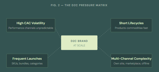 D2C brands face a uniquely brutal combination of pressures that make GTM discipline non-negotiable at scale. High CAC volatility, short product life cycles, frequent launches across SKUs and categories, and the complexity of managing own-site, marketplaces, social commerce, and offline simultaneously—all at once.